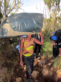 | 朝6時半に起きて、7時から朝食。で7時半に出発のはずが、8時半出発。まぁアフリカなのでそんなの誰も気にしない。 朝ご飯は、クレープみたいなのとパンと玉子焼きとソーセージ。その前に、見た目も食感も『おしるこ』のようなスープが出てくる(毎朝)けど、全く味がしない。甘くもないし辛くもない。あれは一体何やったんやろう??一回聞いたけど、コックがスワヒリ語だったので全く分からなかった。豆ではないことだけ分かった。 2日目は森を抜け、少し視界が開けたところを歩きます。ゴツゴツした岩場もいっぱい出てきて、やや急な登りもある。この辺から、喋るとしんどいので、みんな黙々とただ歩く。それでもポーター達は頭に荷物を載せ、スイスイ追い抜いていきます。ナイスバランス!! |
